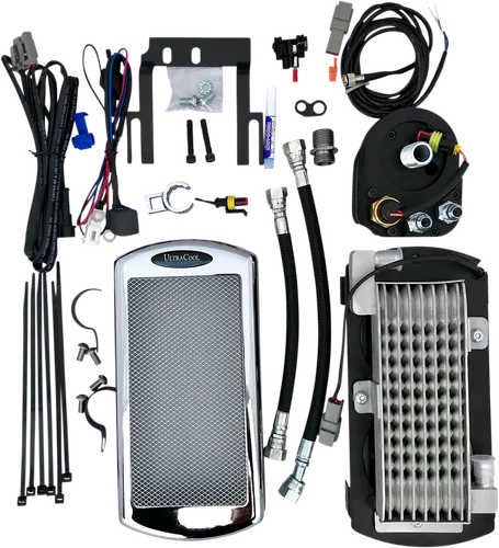 Experience the cooling power of the UltraCool Oil Cooler 3.0 Kit! This specially designed oil cooler is made for maximum heat dissipation and features a high-performance aluminum heat exchanger with turbulators for improved results. In addition, it features plug-and-play wiring with waterproof connectors that make it simple to connect to the battery under the seat. With this efficient product, you can reduce temperatures by up to fifty degrees Fahrenheit. The perfect addition to any motorcyclist's inventory, this cooler is ideal for those looking to tackle intense conditions and experience unparalleled ride quality. Install today and let the UltraCool Oil Cooler 3.0 Kit take your ride experience to new heights!